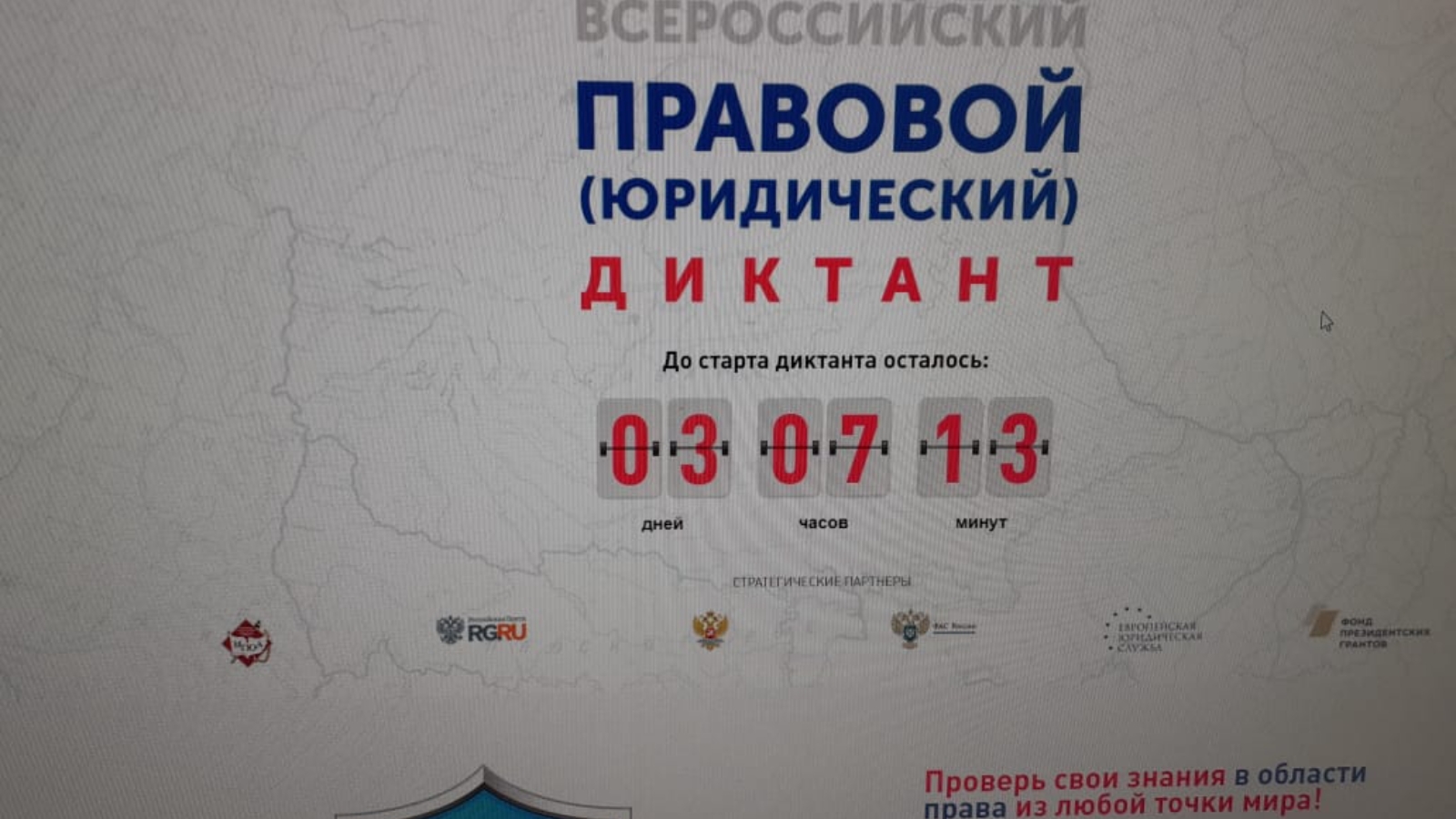 С 3 по 10 декабря 2020 года в целях оценки уровня правовой грамотности населения пройдет Четвертый Всероссийский правовой (юридический) диктант. Соорганизаторами Диктанта выступают Общероссийская общественная организация «Ассоциация юристов России» и Общероссийская общественная организация «Деловая Россия» при поддержке Федерального государственного бюджетного образовательного учреждения высшего образования «Московский государственный юридический университет имени О.Е.Кутафина(МГЮА)