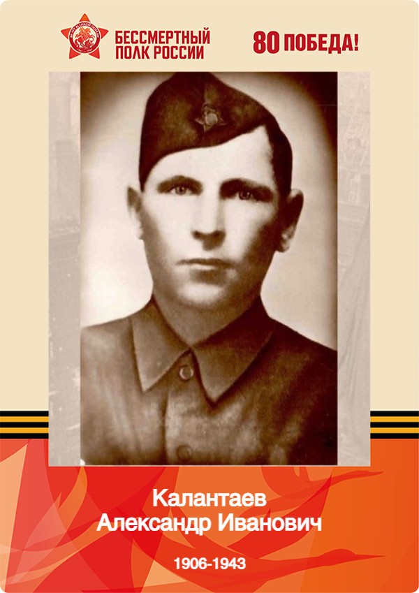 "...Война потребовала от народа напряжения всех сил, колоссальных жертв, невероятной стойкости и непоколебимого мужества советских людей. Мой прадед, Калантаев Александр Иванович, солдат Великой Отечественной войны, родился 6 июня 1906 года в селе Тетеево Татарской АССР. В 1941 году его призвали на фронт. Служба прадеда проходила в составе зенитной артиллерии, задачей которой было уничтожение вражеских самолётов вблизи Ленинграда. Бои были тяжёлыми и кровопролитными, наши бойцы демонстрировали невиданное мужество и отвагу. В одном из жестоких боёв прадед получил тяжёлое ранение, которое оказалось смертельным. Моя прабабушка вскоре получила известие о гибели мужа. Тогда же ей пришлось одной растить пятерых маленьких детей, оставшись вдовой в военное время. Спустя много лет один из бывших однополчан отца поделился воспоминаниями о последнем сражении прадеда, рассказав, что выжило лишь несколько бойцов из всего подразделения. Александр Иванович похоронен в братской могиле, и хотя судьба его оборвалась столь трагично и рано, память о нём живёт вечно. Мне бесконечно больно осознавать потерю близкого родственника, погибшего за наше счастье и мирное небо над головой. За проявленное геройство и несгибаемую волю моего дедушки я испытываю глубочайшую благодарность и преклоняю голову перед всеми героями той страшной войны. Вечная слава нашим победителям, отдавшим жизни ради светлого будущего нашей страны! Мы никогда не забудем их великий подвиг!"...