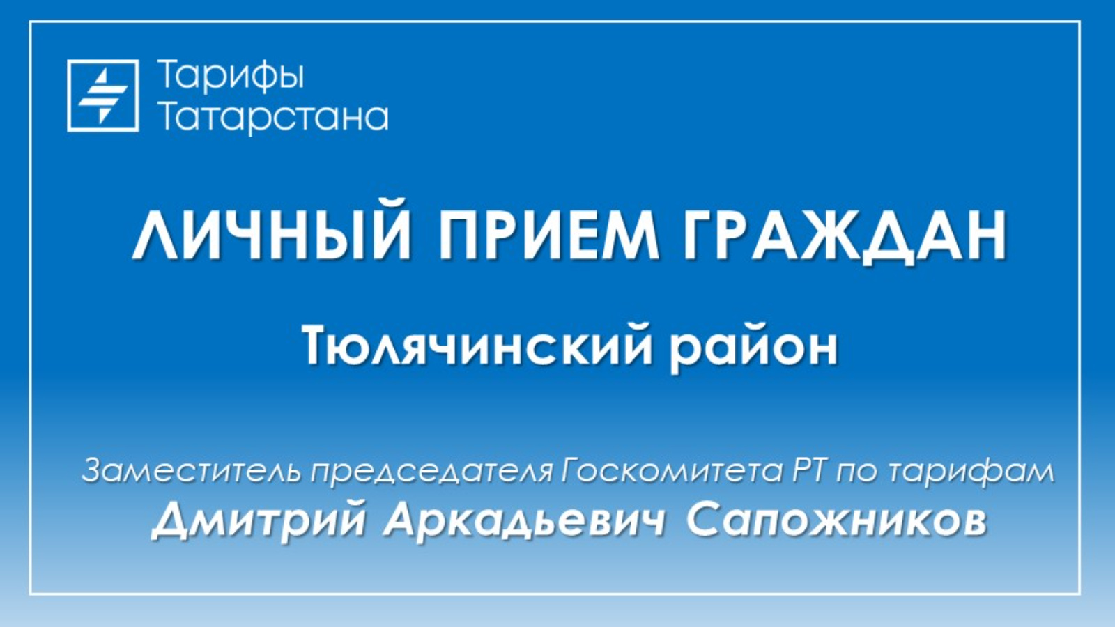 15 июля 2025 года заместитель председателя Госкомитета РТ по тарифам Дмитрий Сапожников совершит рабочий визит в Тюлячинский муниципальный район.