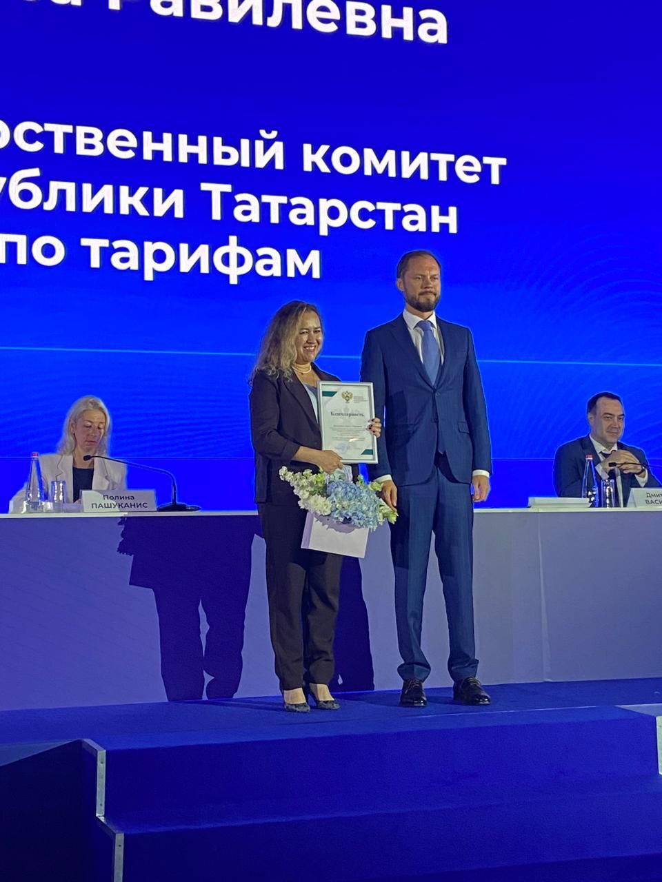 Завершилась конференция торжественной церемонией награждения отличившихся специалистов. Начальник отдела регулирования и контроля платы за технологическое присоединение Государственного комитета Республики Татарстан по тарифам Нафися Белалеева была награждена Благодарностью ФАС России. Награду вручил заместитель руководителя ФАС России Виталий Королёв.