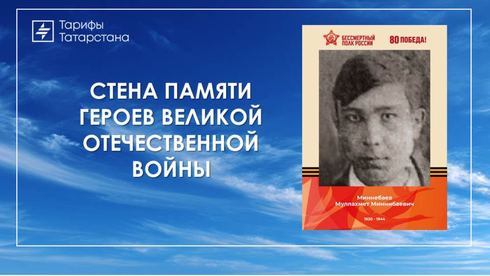 «Миннебаев Муллахмет Миннибаевич родился в 1920 году в селе Миннибаево Альметьевского района Республики Татарстан. В мирной жизни он успел окончить Куйбышевский речной техникум.
