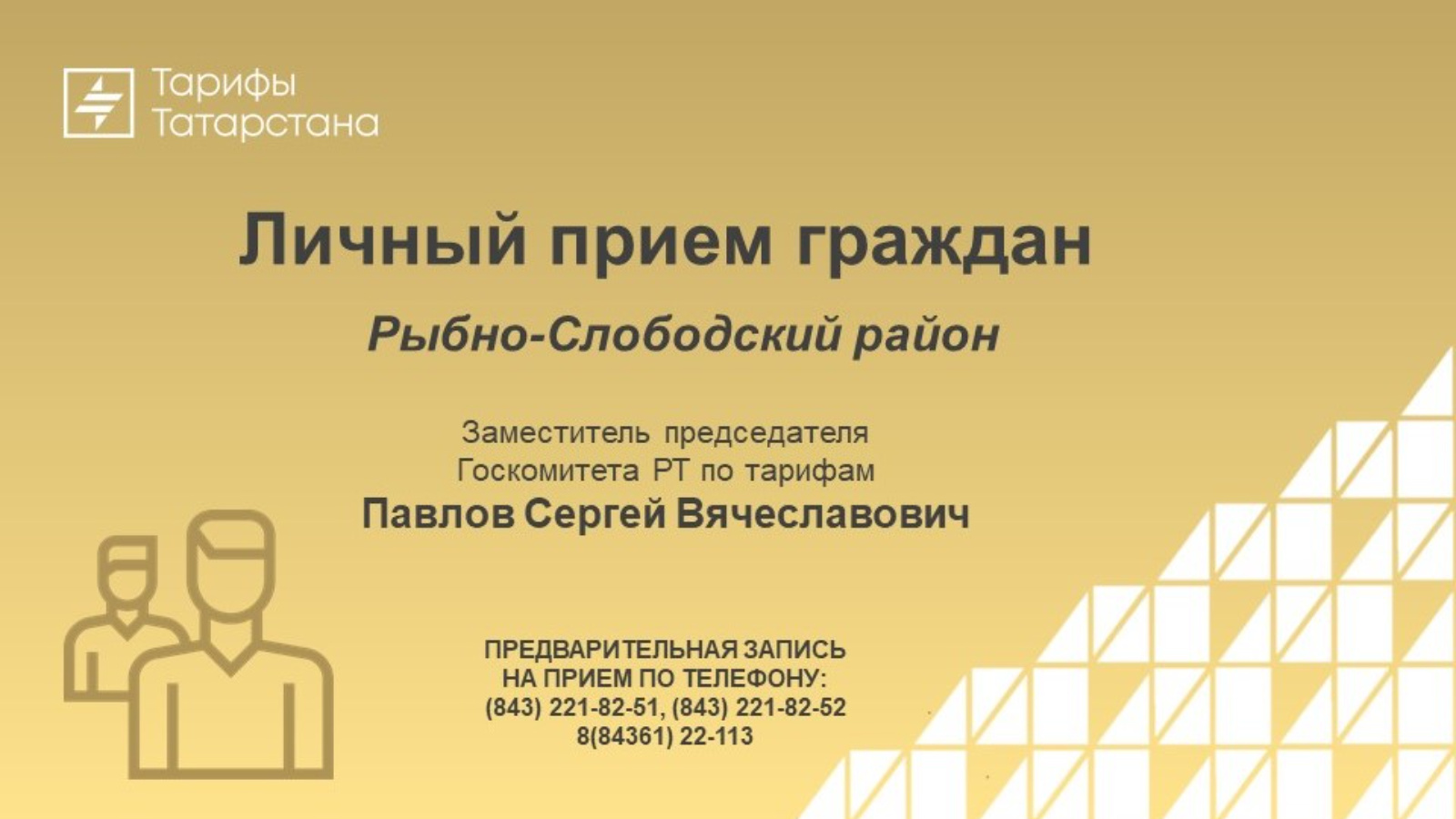 5 сентябрьдә ТР Тарифлар буенча дәүләт комитеты рәисе урынбасары Сергей Павлов эш визиты белән Балык Бистәсе муниципаль районында булачак, аның барышында Балык бистәсе, Ленин урамы, 48 адресы буенча гражданнарны шәхсән кабул итү планлаштырыла.