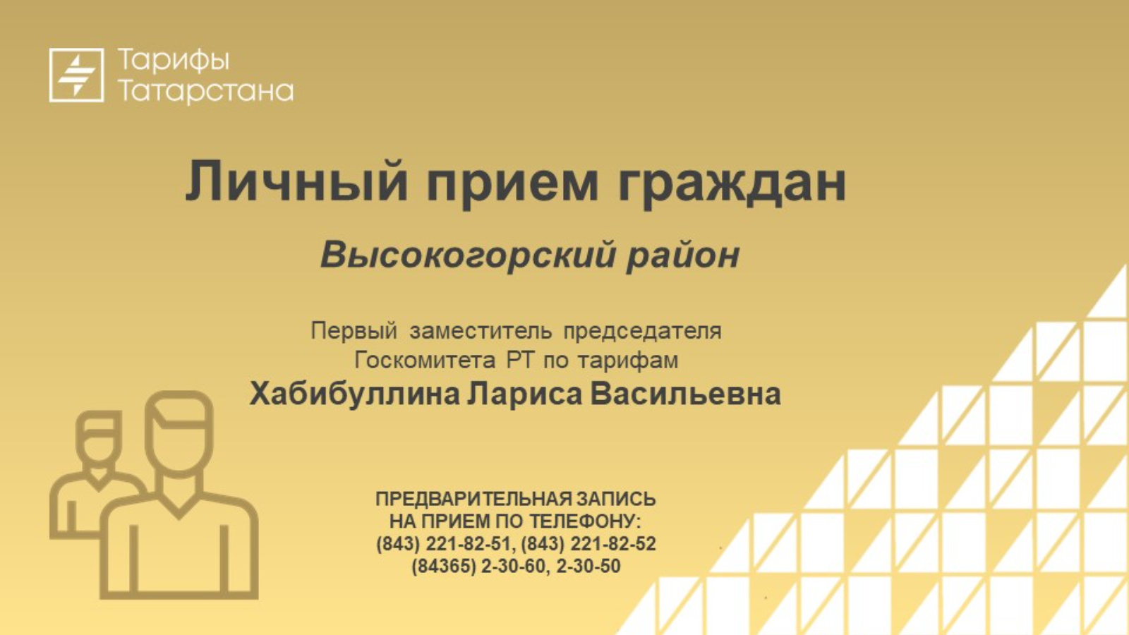 Иртәгә, 12 сентябрьдә, ТР Тарифлар буенча дәүләт комитеты рәисенең беренче урынбасары Лариса Хәбибуллина эш визиты белән Биектау муниципаль районында булачак, аның барышында 422700, Татарстан Республикасы, Биектау муниципаль районы, Биектау тимер юл станциясе бистәсе, Кооператив урамы, 5 адресы буенча гражданнарны шәхсән кабул итү планлаштырыла.