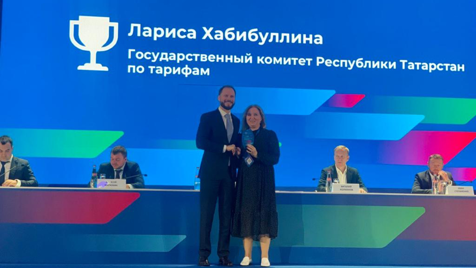 Татарстан Республикасы Тарифлар буенча дәүләт комитеты рәисенең беренче урынбасары Лариса Хәбибуллина Бөтенроссия тариф конференциясе эшендә актив катнашкан өчен истәлекле стела белән бүләкләнде.