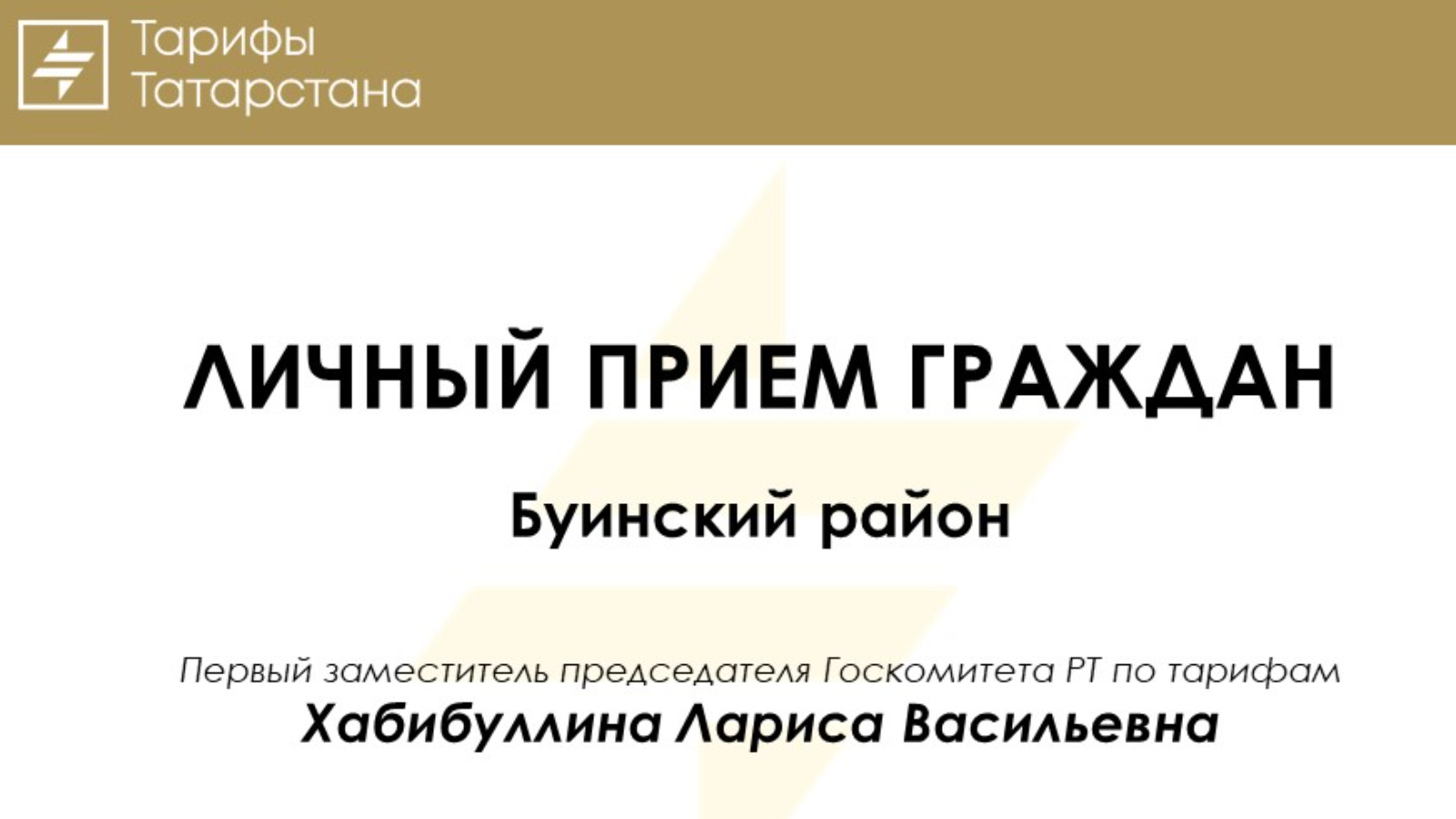 2025 елның 27 маенда ТР Тарифлар буенча дәүләт комитеты рәисенең беренче урынбасары Лариса Хәбибуллина эш визиты белән Буа муниципаль районына барачак, анда гражданнарны түбәндәге адрес буенча кабул итү планлаштырыла: Буа шәһәре, Жорес ур., 110 а.