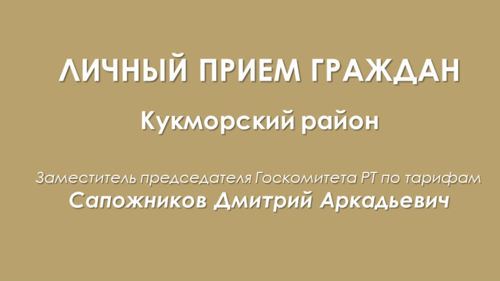 2025 елның 8 апрелендә ТР Тарифлар буенча дәүләт комитеты рәисенең беренче урынбасары Лариса Хәбибуллина эш визиты белән Кукмара муниципаль районына барачак, аның барышында гражданнарны түбәндәге адрес буенча кабул итү планлаштырыла: Кукмара районы, Кукмара штп. Ленин урамы, 13.