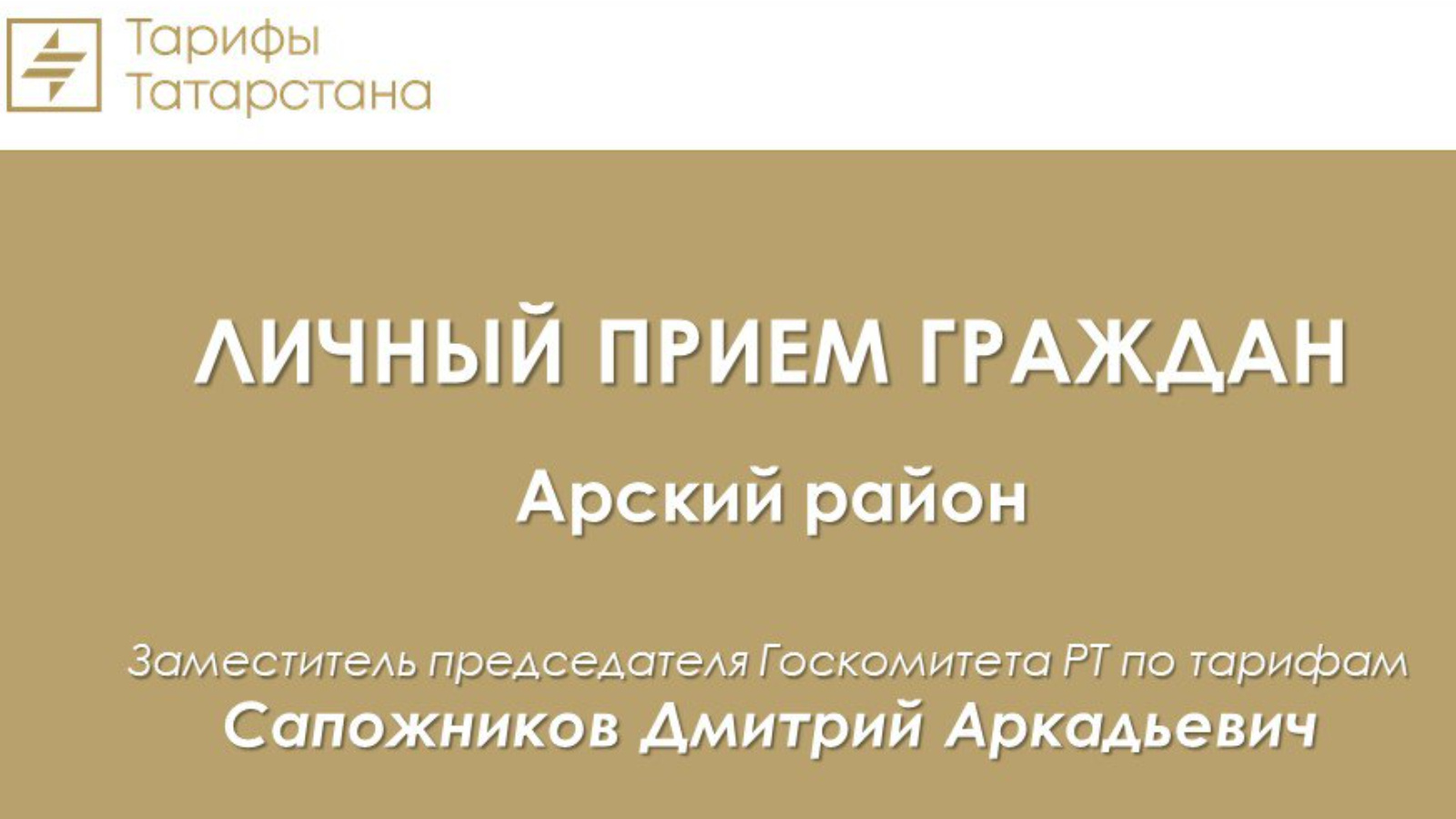 2025 елның 22 апрелендә ТР Тарифлар буенча дәүләт комитеты рәисе урынбасары Дмитрий Сапожников эш визиты белән Арча районына барачак, анда Арча шәһәре, Совет мәйданы, 14 йортта гражданнарны кабул итү планлаштырыла. 📍
