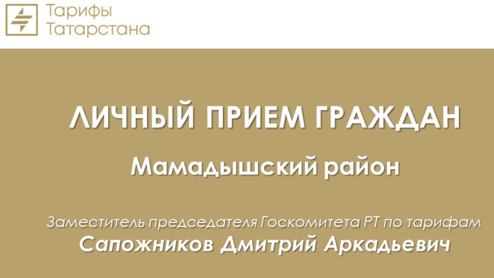 2025 елның 22 апрелендә ТР Тарифлар буенча дәүләт комитеты рәисе урынбасары Дмитрий Сапожников эш визиты белән Мамадыш районына барачак, анда гражданнарны түбәндәге адрес буенча кабул итү планлаштырыла: Мамадыш шәһәре, М.Җәлил урамы, 23/33 йорт.