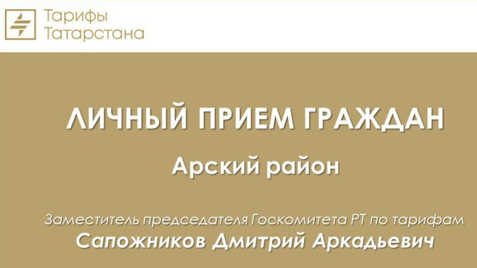 2025 елның 22 апрелендә ТР Тарифлар буенча дәүләт комитеты рәисе урынбасары Дмитрий Сапожников эш визиты белән Арча районына барачак, анда Арча шәһәре, Совет мәйданы, 14 йортта гражданнарны кабул итү планлаштырыла.