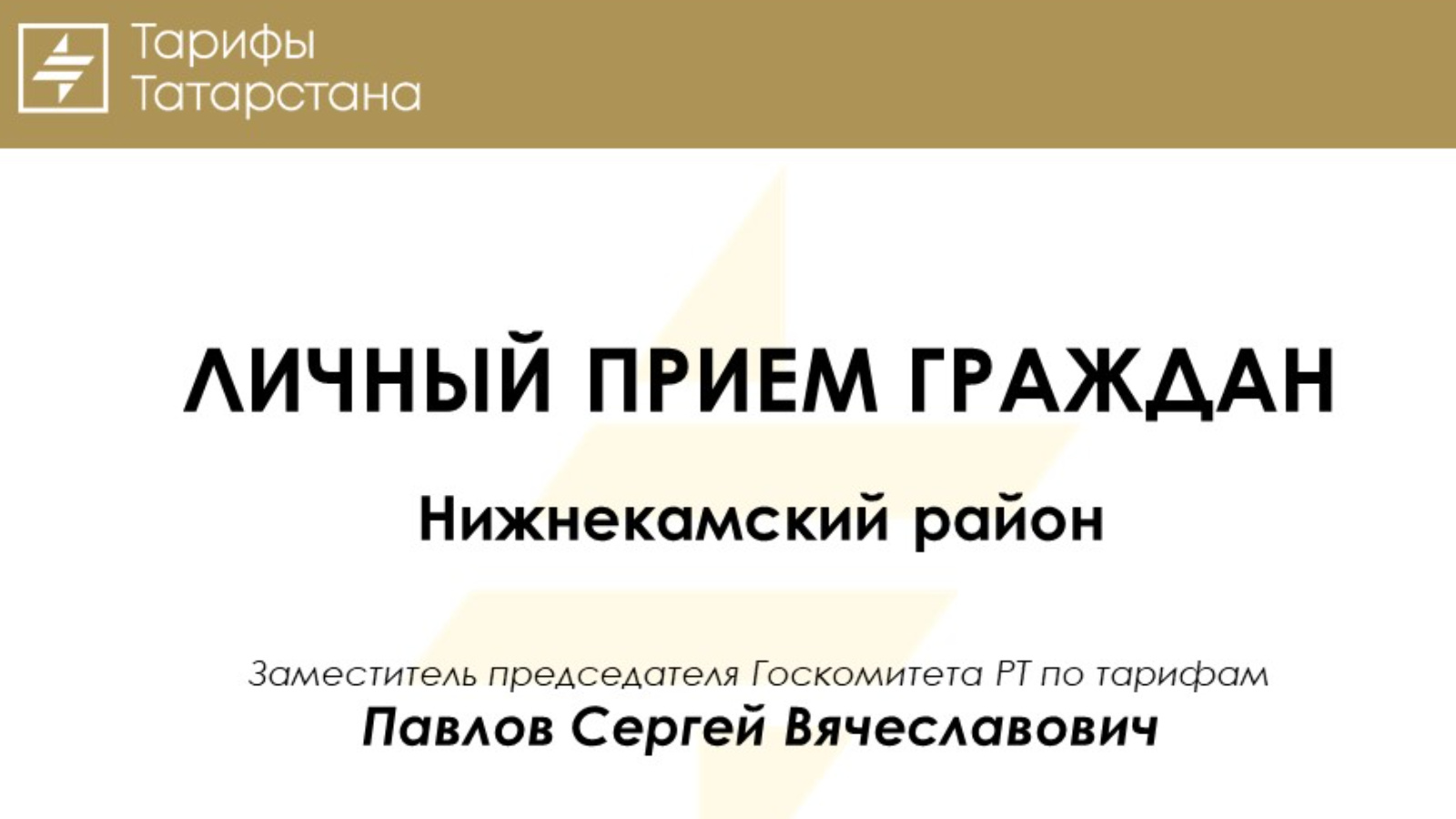 1 июльдә, ТР Тарифлар буенча дәүләт комитеты рәисенең урынбасары Сергей Павлов эш визиты белән Түбән Кама муниципаль районында булачак, аның барышында гражданнарны шәхсән кабул итү планлаштырыла, түбәндәге адрес буенча: Түбән Кама шәһәре, Төзүчеләр урамы,12.