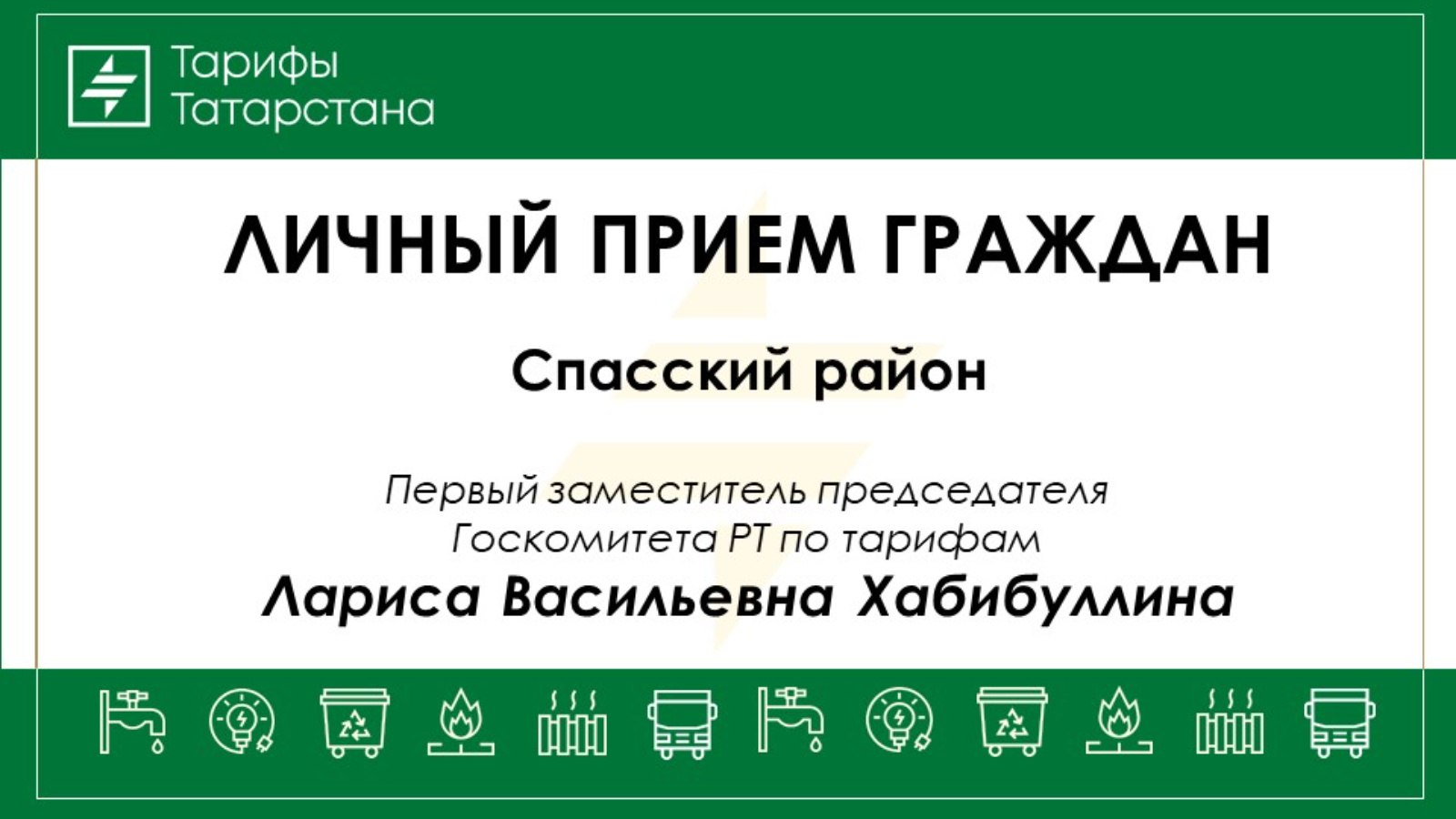 Иртәгә, 26 нчы августта, ТР Тарифлар буенча дәүләт комитеты рәисенең беренче урынбасары Лариса Хәбибуллина Спас муниципаль районында гражданнарны шәхсән кабул итәчәк.