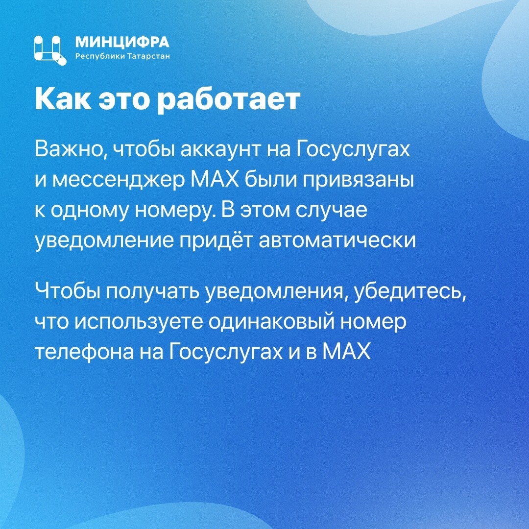 Дәүләт хезмәтләрендә бирелгән гаризаның статусын хәзер күпкә тизрәк белергә мөмкин. Иң популяр хезмәтләр күрсәтү барышы турында белдерүләр порталның шәхси кабинетына гына түгел, ә МАХ мессенджерындагы Дәүләт хезмәтләре ботына да килә. Ул зәңгәр галочка белән билгеләнгән.
